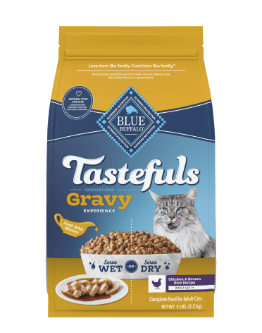 Serve it dry for a satisfying crunch or just add water to transform it into savory gravy. Made with real chicken and wholesome brown rice, BLUE Tastefuls Gravy gives cats irresistible flavor in every bite.