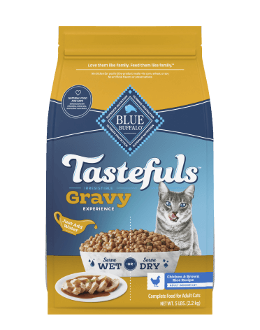 Feed it dry for a crave-worthy crunch or just add water for a savory gravy your pal can’t resist. Made with real chicken and wholesome brown rice, BLUE Tastefuls Gravy has the taste mature cats love.