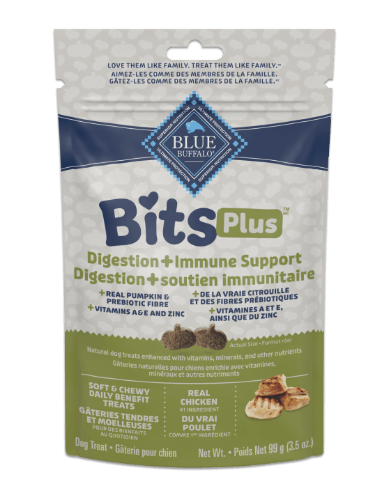 Blue Buffalo Bits Plus Skin & Coat + Immune Support dog treats start with real salmon and contain Omega 3 and Omega 6 fatty acids for a healthy skin and coat. They’re also packed with Vitamin A, Vitamin E, and Zinc to help strengthen your dog’s immune system.