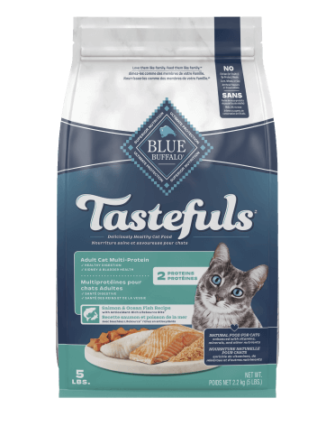 BLUE Tastefuls Multi-Protein adult cat food pleases even the most particular palate with two tasty proteins in one — high-quality deboned chicken and turkey — plus wholesome whole grains, fruits, and veggies.