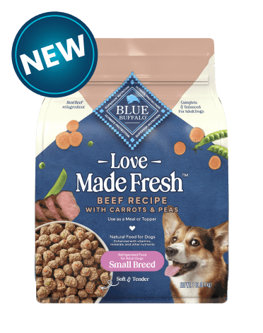 Crafted with real chicken, delicious veggies, and cooked to perfection. Blue Buffalo Love Made Fresh refrigerated meatballs for small breed dogs come in an easy-to-reseal pouch. They're a ready-to-serve way to elevate mealtime. Plus, they can be served on their own or as a dog food topper, making meals flexible & delicious.